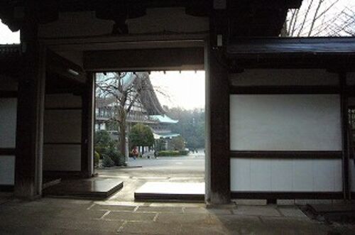 横浜・鶴見・大本山総持寺 百間廊下 仏殿の南方にある。東西方向の桁行142m,梁間3.6mで,間に3つの門を設け廊下は角柱に舟肘木をのせ,虹梁で繋ぎ,柱間にガラス戸を入れる。 各門は桁行1間梁間1間,切妻造で,桟瓦葺屋根を架ける。仏殿前面の空…